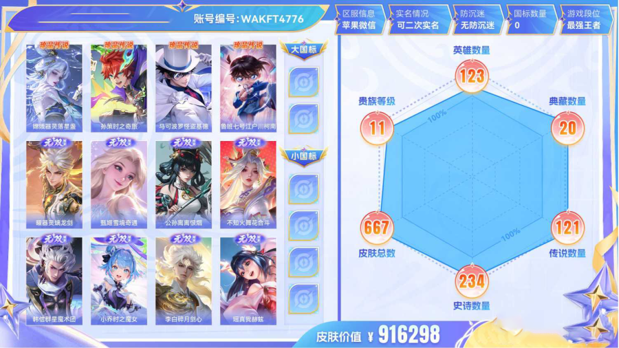 【WAKFT4776】 珍品传说4 无双10 典藏20 星元7 传说121 史诗234 限定308 英雄123 皮肤667 贵族无双级 皮肤价值:916298